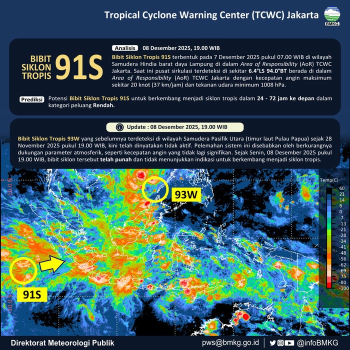Badan Meteorologi, Klimatologi, dan Geofisika () menginformasikan Bibit Siklon Tropis 93W di sebelah utara Indonesia sudah punah. Saat ini tersisa Bibit Siklon Tropis 91S di sebelah barat Bengkulu hingga Lampung.
