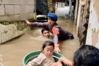 Banjir 1,7 Meter di Kebon Pala Jaktim, Polisi Evakuasi Balita Pakai Ember