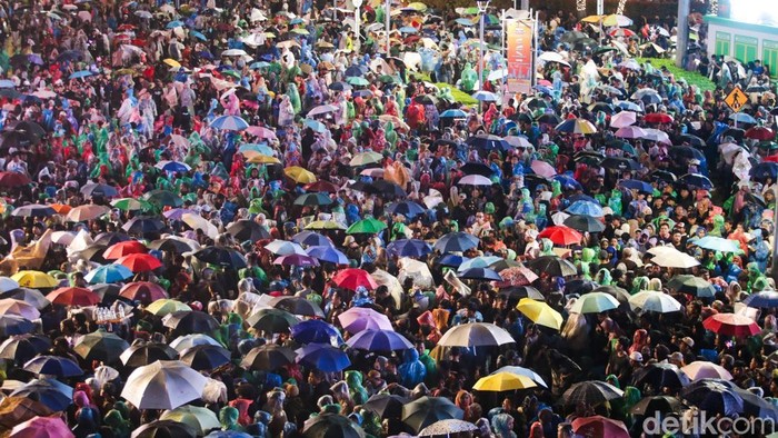 Jakarta – Meski diguyur hujan deras, ribuan warga tetap memadati kawasan Bundaran Hotel Indonesia (HI), Jakarta, untuk menyambut pergantian tahun menuju 2026.