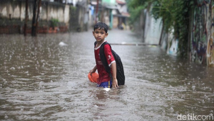 Tangerang Selatan – Jalan Kemuning III diPamulang, Tangerang Selatan (Tangsel)banjirusai diguyur hujan deras.