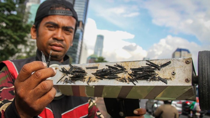 Usmanto membersihkan ranjau paku menggunakan tongkat beroda yang dilengkapi magnet untuk menarik benda terbuat dari metal atau besi. Dia membersihkan ranjau paku Jalan DI Panjaitan arah Cawang hingga lampu merah Kalimalang.