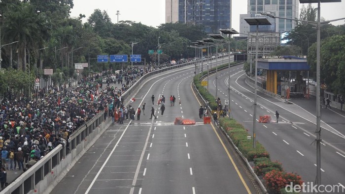 Massa menutup jalan yang dapat digunakan pengendara baik di ruas arteri hingga jalan Tol Dalam Kota arah Semanggi. Namun beberapa demonstran tampak membantu mengarahkan pengendara agar melewati Jalan Widya Chandra.